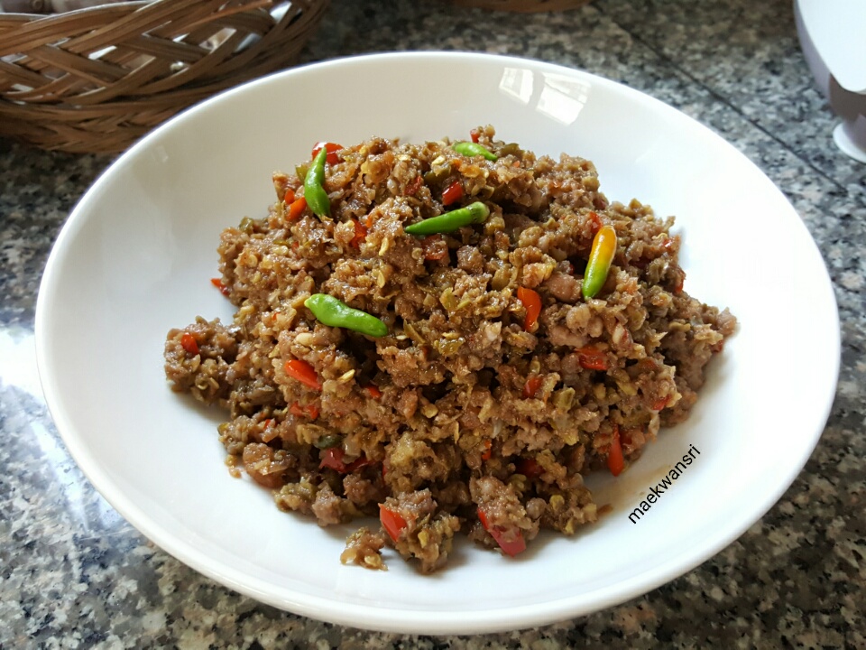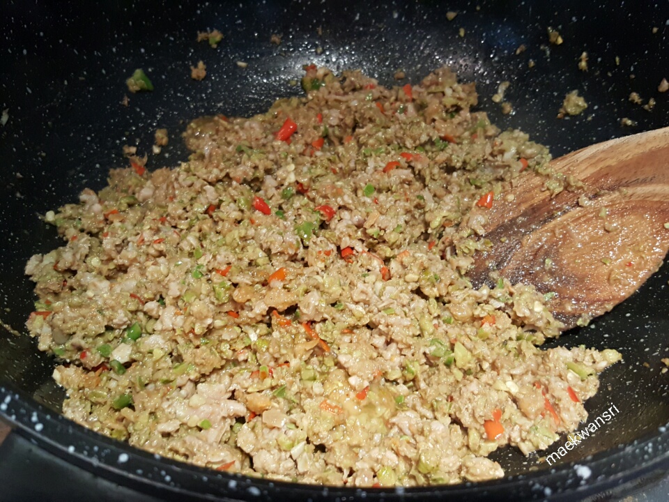 3.ใส่ไก่หรือหมูสับลงไป ผัดให้เข้ากัน ปรุงรสด้วยน้ำตาลปี๊บ น้ำปลา ชิมรสตามชอบ ผัดจนสุกได้ที่
