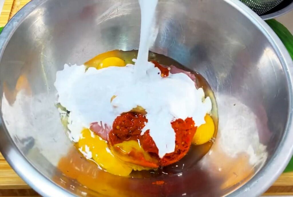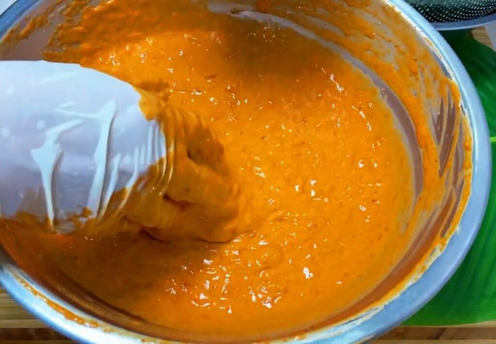 – นำเนื้อปลาบด ใส่กะละมัง และใส่พริกแกง น้ำตาล น้ำปลา ไข่ไก่ และกะทิ ลงไป แล้วคลุกให้เข้ากัน