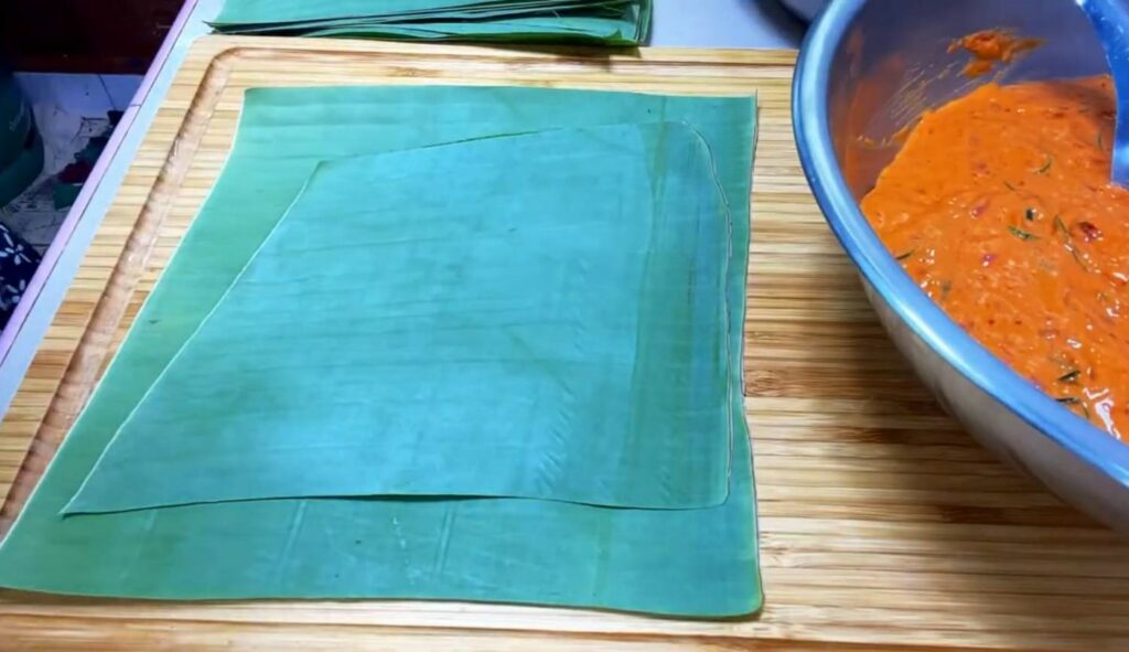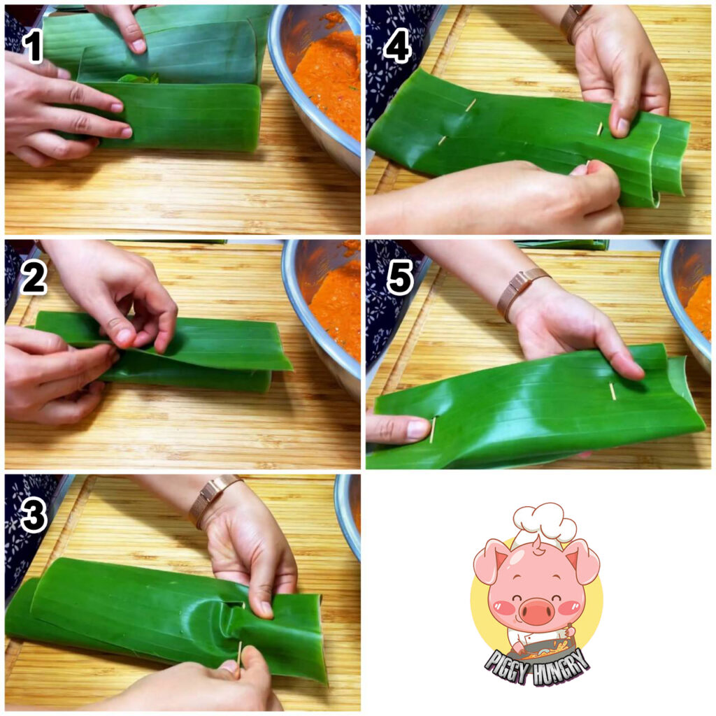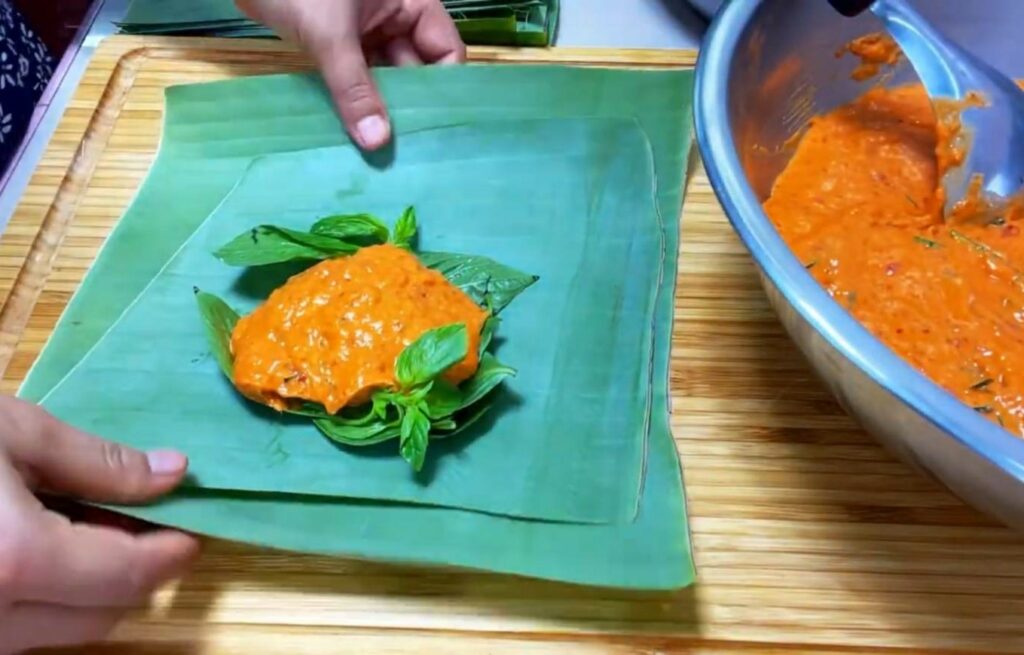 -วางใบโหระพาลงบนใบตอง แล้วตักตัวห่อหมกลงไป