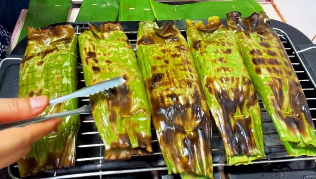 -แล้วนำมาย่างด้วยไฟอ่อน โดยทาน้ำมันบนใบตองเพื่อให้ใบตองเหลือง เงา สวย น่าทานค่ะย่างเรื่อยๆ จนใบตองสุก หอมกลิ่นของห่อหมก