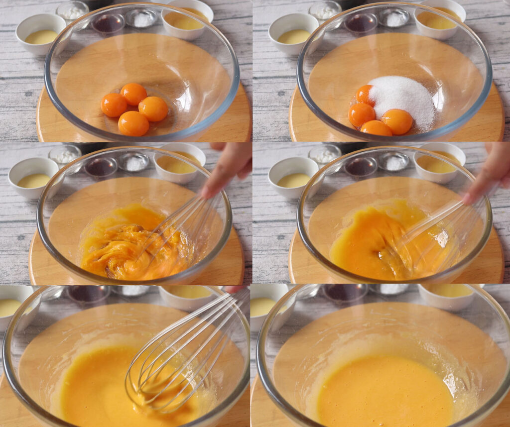1.ผสมไข่แดง น้ำตาลทราย+เกลือป่น ตีจนน้ำตาลทรายละลาย