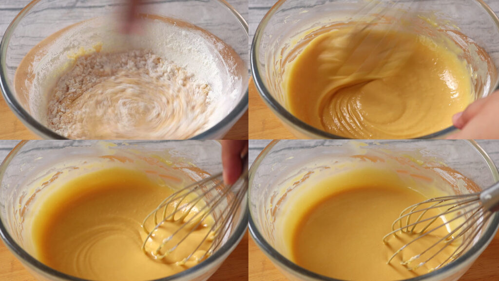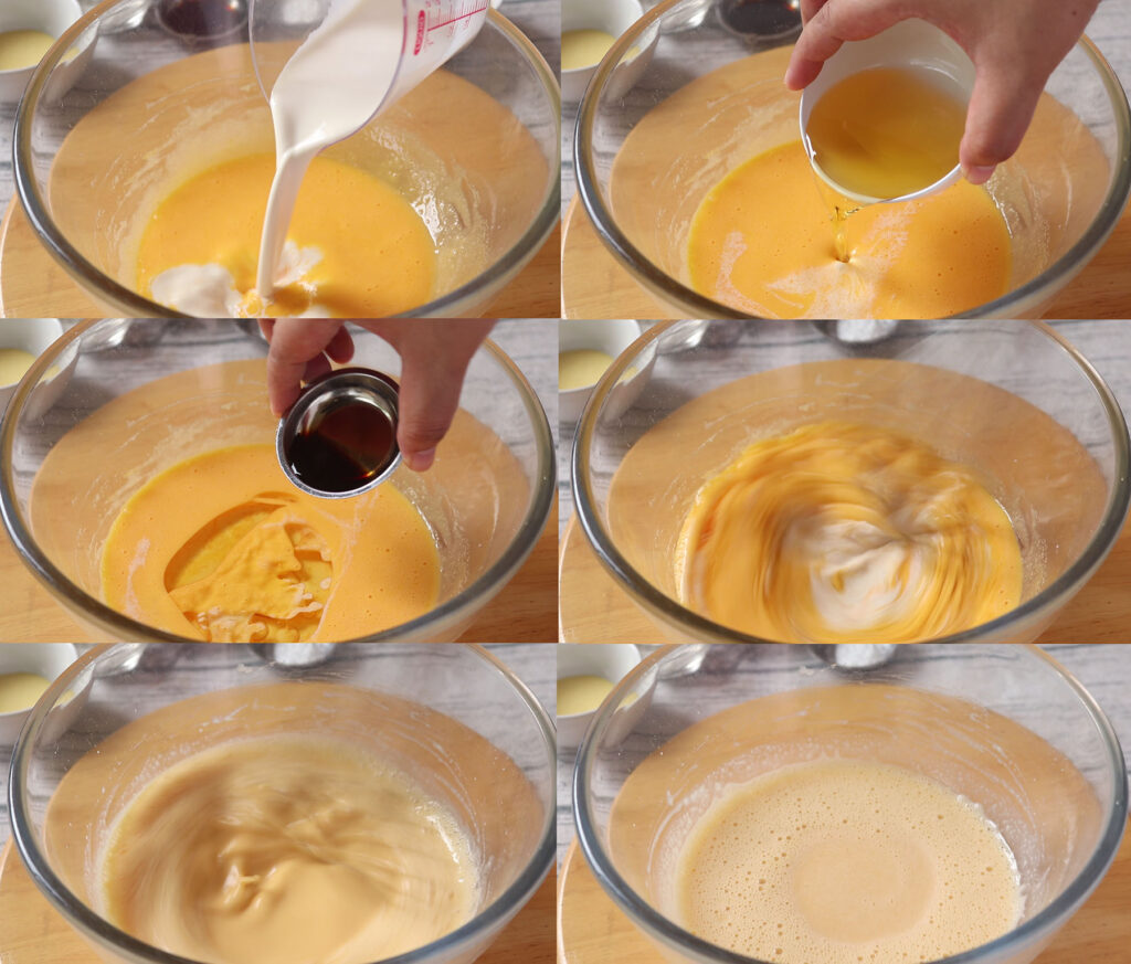 2.จากนั้นใส่นมข้นจืด น้ำมันรำข้าว กลิ่นวานิลลา ลงไปคนให้เข้ากัน
