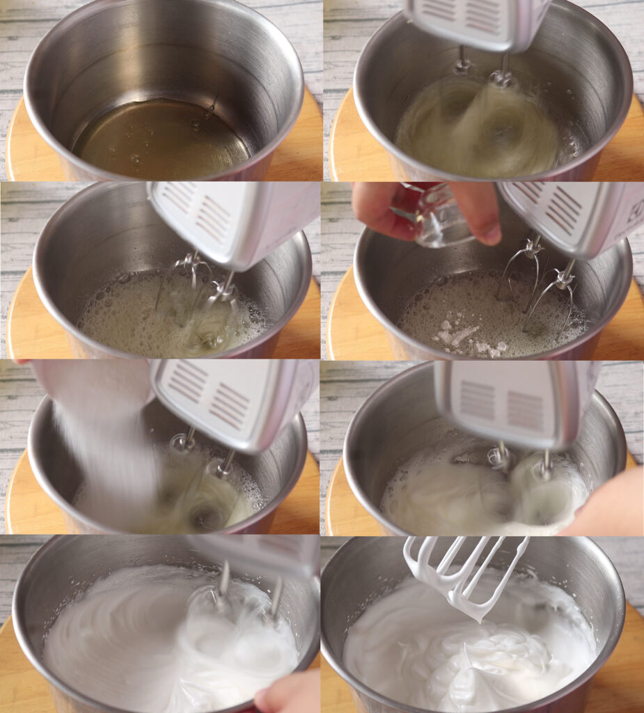 5.ไข่ขาว นำมาตีจนเป็นฟองหยาบใส่ครีมออฟทาร์ทาร์ลงไปตีพอเข้ากัน จากนั้นทะยอยใส่น้ำตาลลงไป (แบ่งใส่สัก 3 รอบค่ะ)ตีจนตั้งยอด