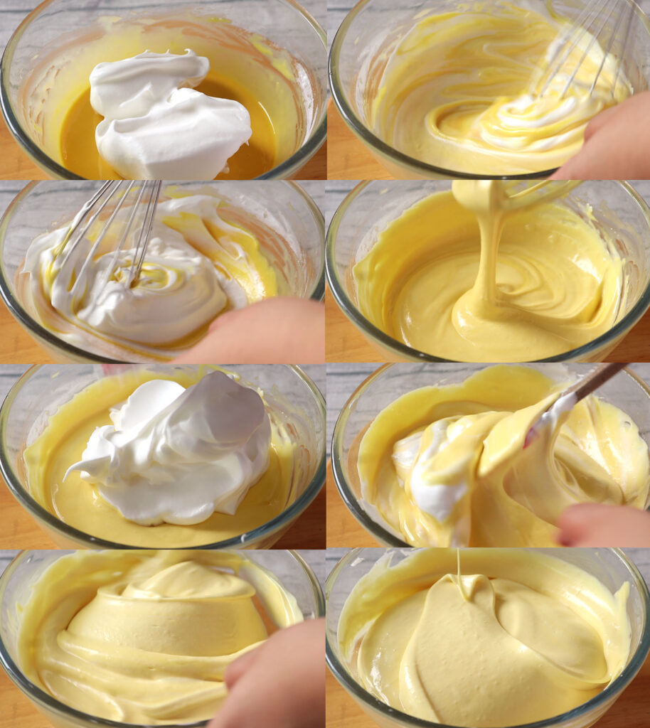 6.แบ่ง(เมอแรงค์)ไข่ขาวมาบางส่วนตะล่อมจนเข้ากัน พอเข้ากันแล้วใส่ที่เหลือลงไป แล้วตะล่อมจนเข้ากัน