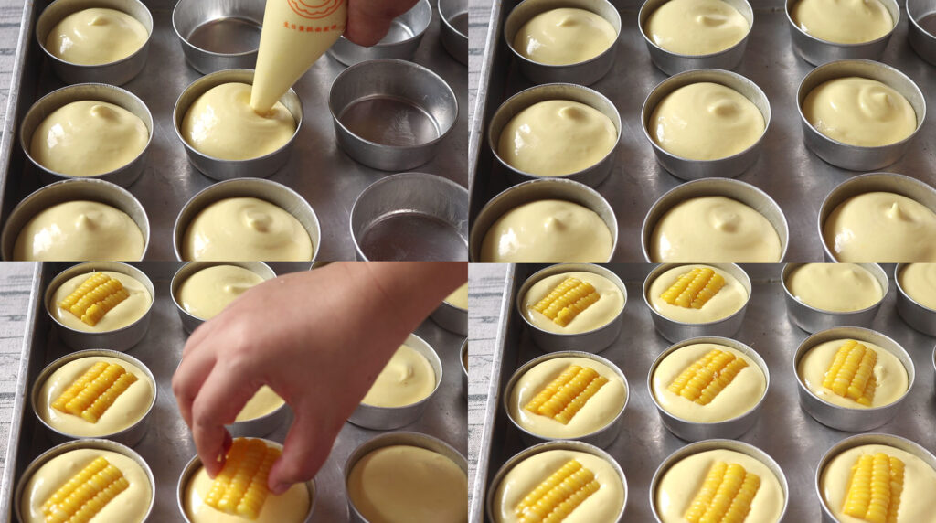 7.หยอดเค้กลงไปในพิมพ์สูงประมาณ 3/4 ถ้วย (ทาเนยลงไปในพิมพ์ด้วยนะคะ) วางข้าวโพดลงด้านบน