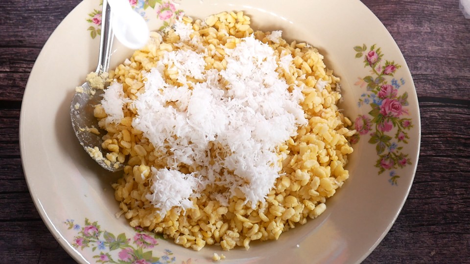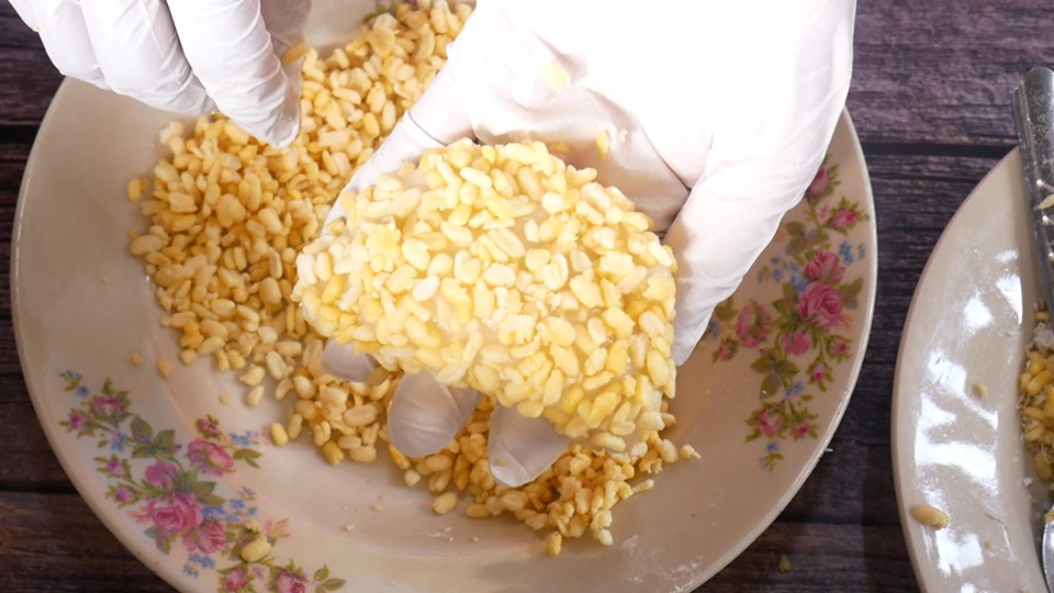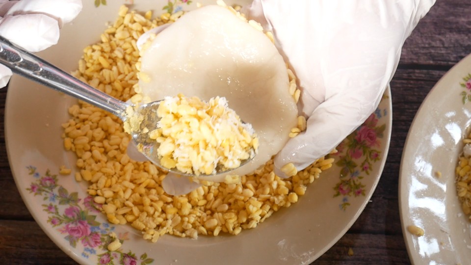 7. หลังจากนั้นให้ตักแป้งวางบนถั่วจานที่ไม่ได้ใส่มะพร้าวเพื่อให้ถั่วเคลือบชั้นนอก และตักถั่วจานที่ผสมมะพร้าวใส่ลงไปเป็นใส้ หลังจากนั้นบีบขอบแป้งให้ติดกัน แล้วนำลงไปคลุกบนจานถั่วที่ไม่ผสมมะพร้าวอีกครั้ง พร้อมเสิร์ฟทานคู่กับน้ำตาลผสมงาคั่วหอมๆ