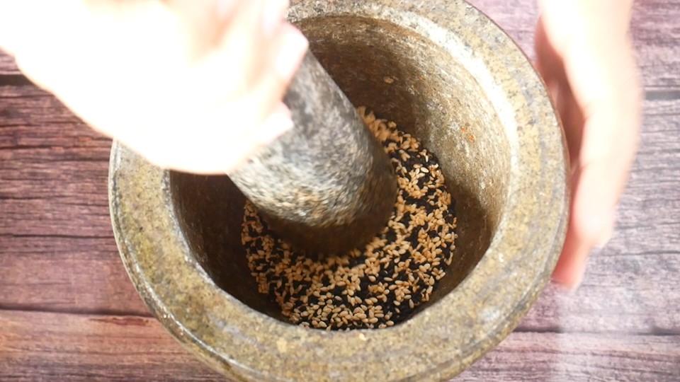 1. ใส่งาขาวและงาดำลงกะทะ คั่วด้วยไฟอ่อนจนงาเหลืองหอม