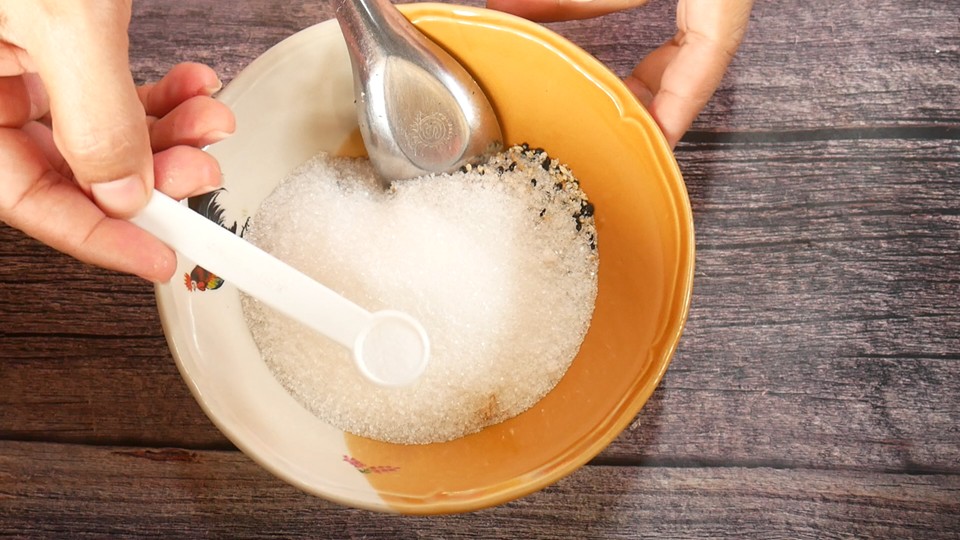 2.หลังจากนั้นนำไปตำพอหยาบๆ ผสมกับน้ำตาลทรายและเกลือคนให้เข้ากัน