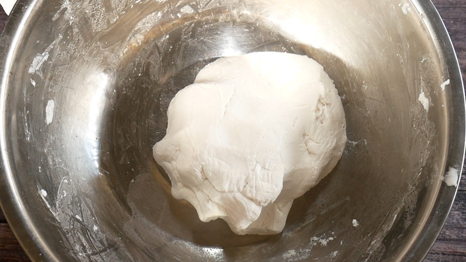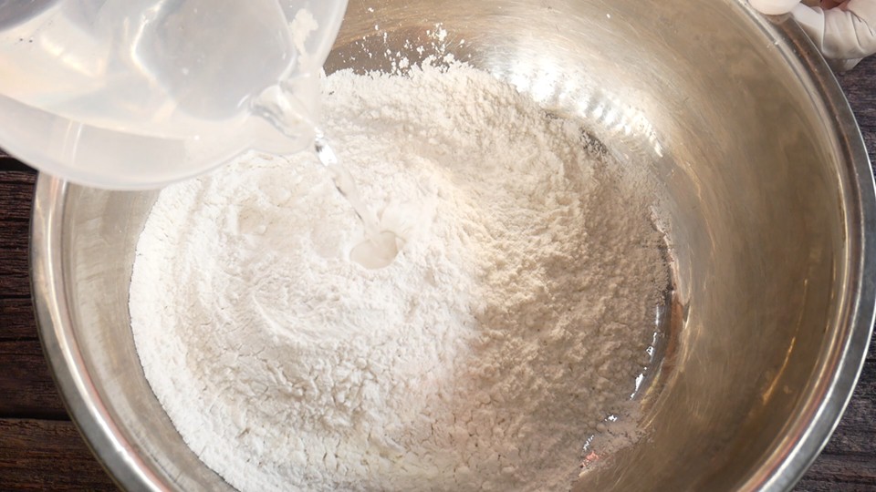 4. ให้ตั้งน้ำใส่หม้อรอไว้ให้น้ำเดือดเพื่อให้ใช้สำหรับต้มแป้ง ระหว่างรอให้น้ำเดือดให้ผสมแป้งและน้ำเปล่านวดให้เนียน