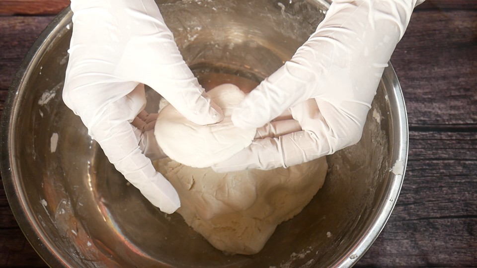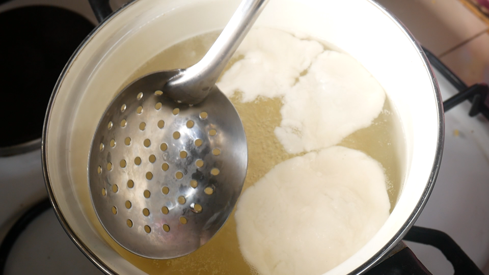 5. หลังจากนั้นปั้นแป้งเป็นก้อนกลม และกดให้แบน ดูขนาดให้พอดี ไม่เล็กหรือใหญ่เกินไป และนำลงต้มในน้ำเดือด