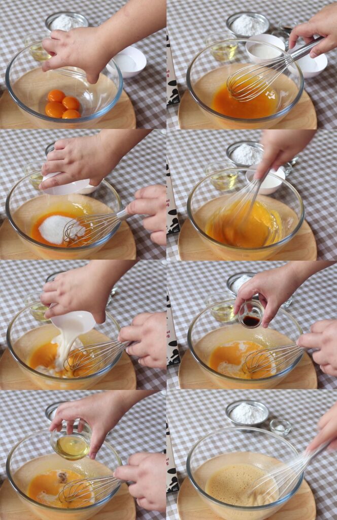 1.ผสมไข่แดง น้ำตาลทราย ตีให้น้ำตาลละลาย แล้วเทนมจืด น้ำมันรำข้าวและกลิ่นวานิลลาลงไปในชามผสม