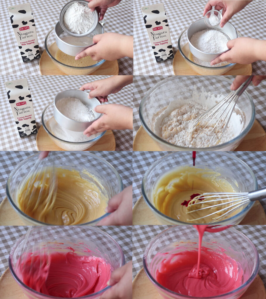 2.จากนั้นร่อนแป้งเค้กและผงฟูลงไปในชามผสม ตะล่อมให้เข้ากัน ผสมสีชมพูลงไป