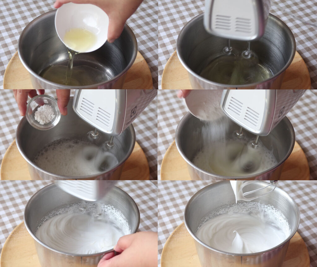 3.ตีไข่ขาว จนเป็นฟองหยาบ ใส่ครีมออฟทาร์ทาร์ลงไปจากนั้นทยอยใส่น้ำตาลลงไป (แบ่งใส่สัก 3 รอบค่ะ)ตีจนตั้งยอดอ่อน-กลาง