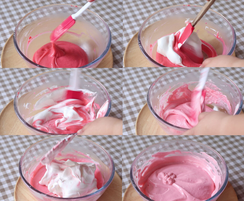 4.นำ(เมอแรงค์)ไข่ขาวมา 1/3 ส่วนตะล่อมจนเข้ากัน จากนั้นใส่ที่เหลือลงไปแล้วตะล่อมจนเข้ากัน