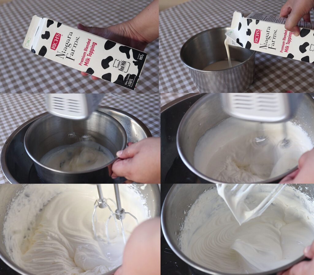 7.นำริชส์ ไนแองการา ฟาร์ม มิลค์ ทอปปิ้ง ในหม้อผสมที่แห้งและเย็น ตีด้วยความเร็วปานกลางหรือสูง จนกระทั่ง ครีมข้นอยู่ตัวตามต้องการ ให้ปริมาตรหลังการตีสูงสุดถึง 3 เท่า ครีมนุ่มเบา หอมละมุนรสนม หวานน้อย