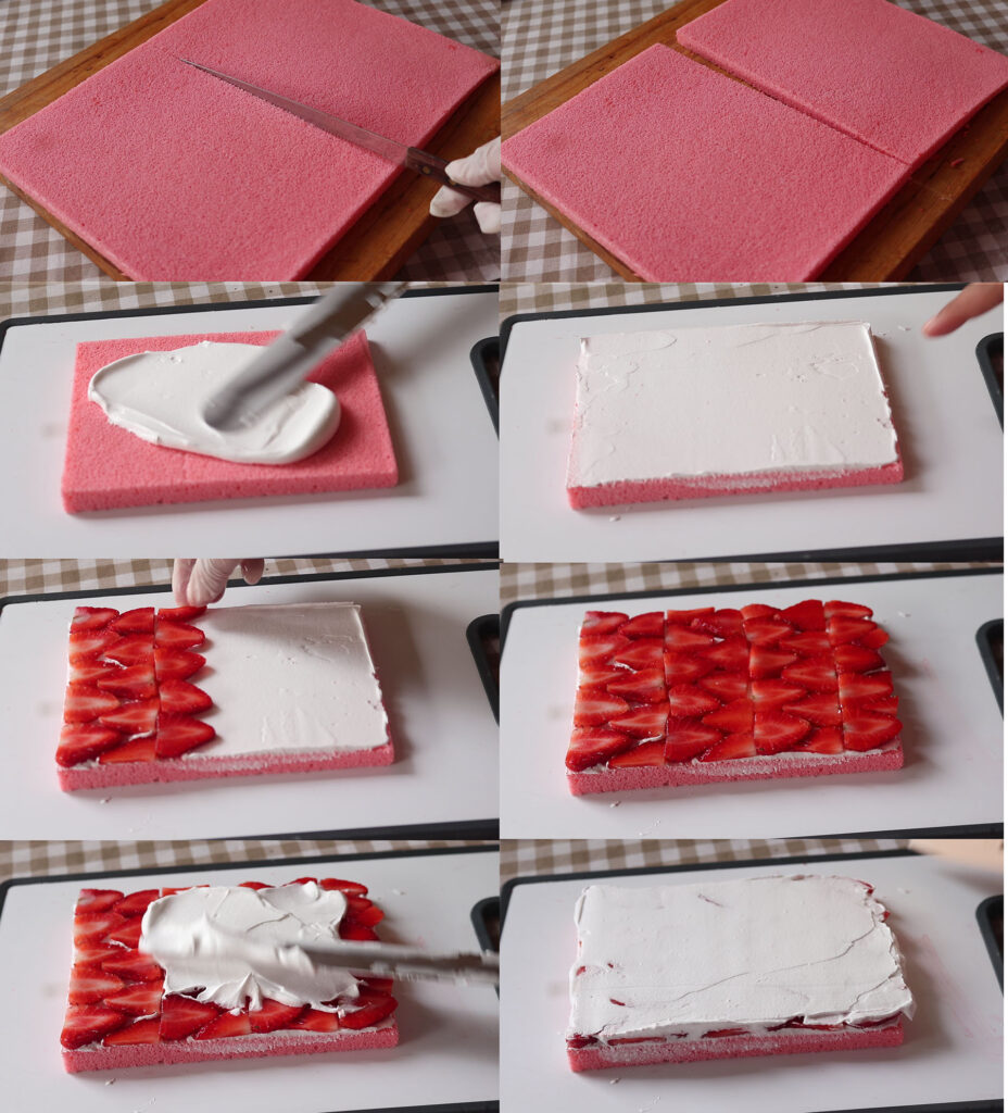 8.ตัดเค้กให้ได้ขนาดตามต้องการจะแบ่ง ½ หรือแบ่ง ¼ ก็ได้ค่ะ ปาดวิปครีมลงไป วางสตรอเบอรี่ ปาดวิมครีมลงไป และวางสตรอเบอรี่ ทำสลับกันจนครบ 4-5 ชั้น