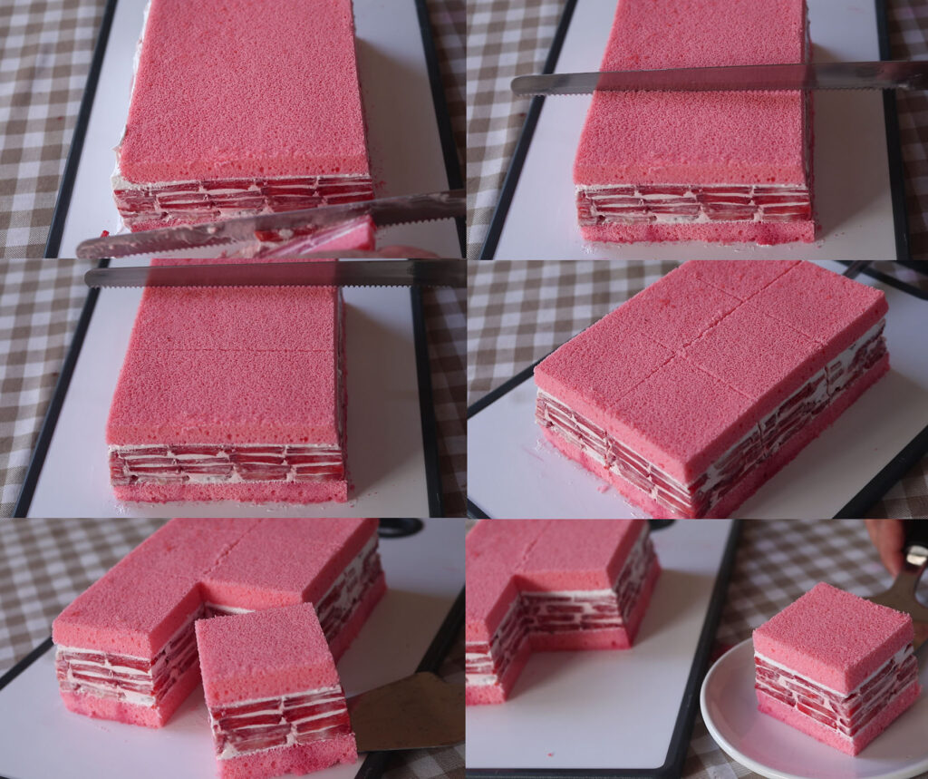 10.พอเค้กเซตตัวแล้ว นำมาตัดขอบที่ไม่สวยออก จากนั้นตัดขนาดตามต้องการ