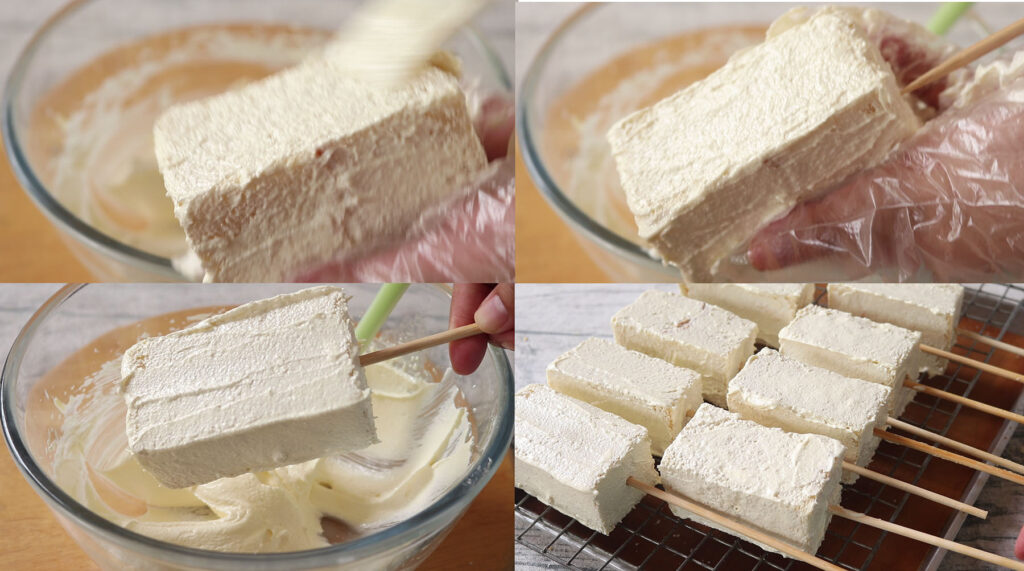 4.ทาเนยลงบนขนมปัง พร้อมเสียบไม้