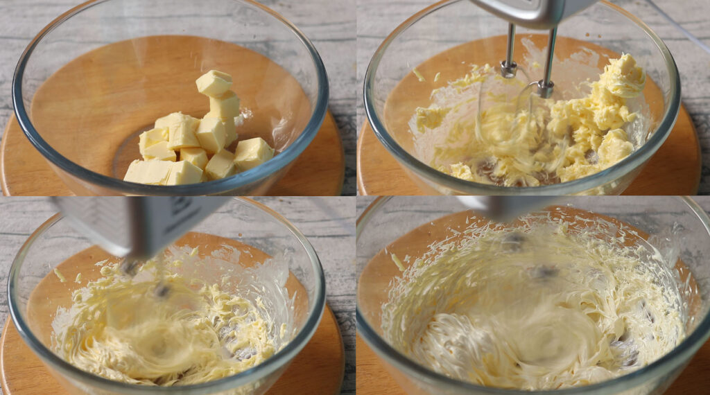 1.นำเนยสดรสเค็ม มาตีจนขึ้นฟู เนยจนสีอ่อนลง