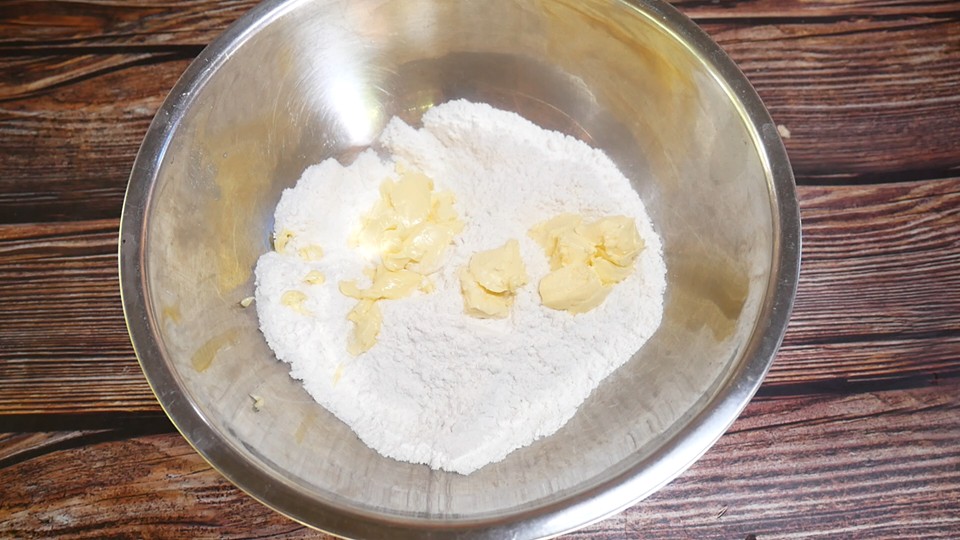 1. ผสมแป้ง น้ำตาลทราย เกลือ และเนย คลุกเคล้าให้เข้ากัน