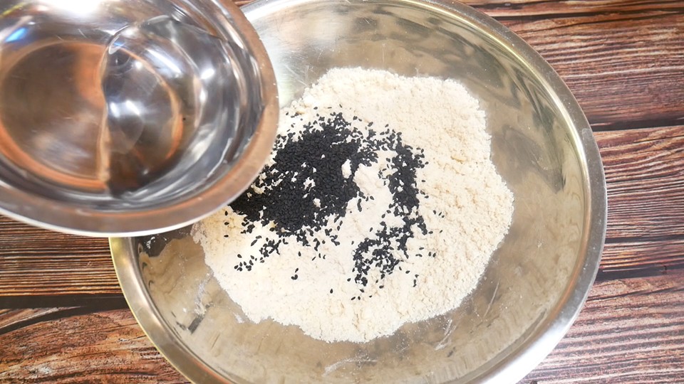 2. หลังจากเข้ากันดีแล้ว ใส่งาดำ และทยอยใส่น้ำสลับกับการคลุกเคล้าให้เข้ากัน