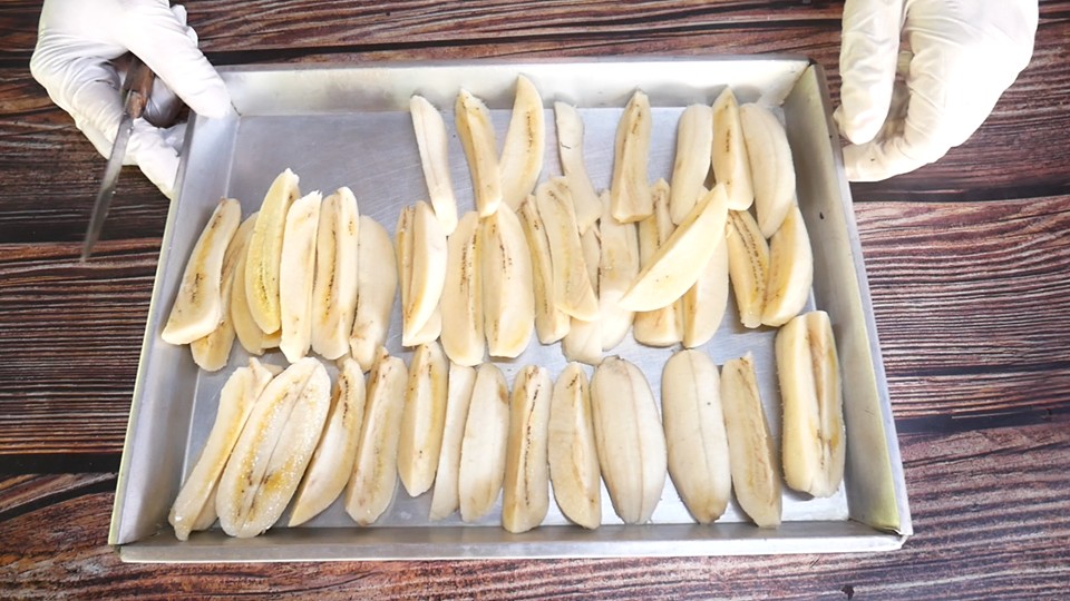 4. ปอกเปลือกกล้วย แล้วผ่าแบ่งตามยาวเป็น 4 ส่วน