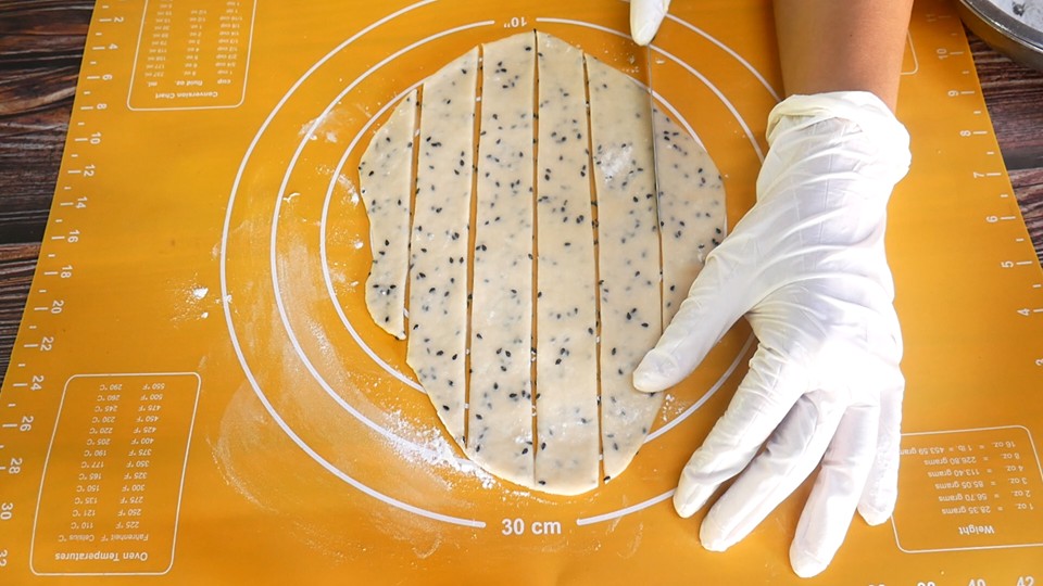 6. ตัดแป้งเป็นเส้น กว้างประมาณ 1 นิ้ว