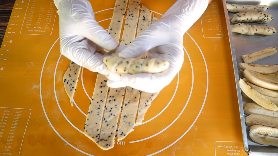 7. ใช้แป้งที่ตัดเป็นเส้นไว้ มาพันรอบชิ้นกล้วย