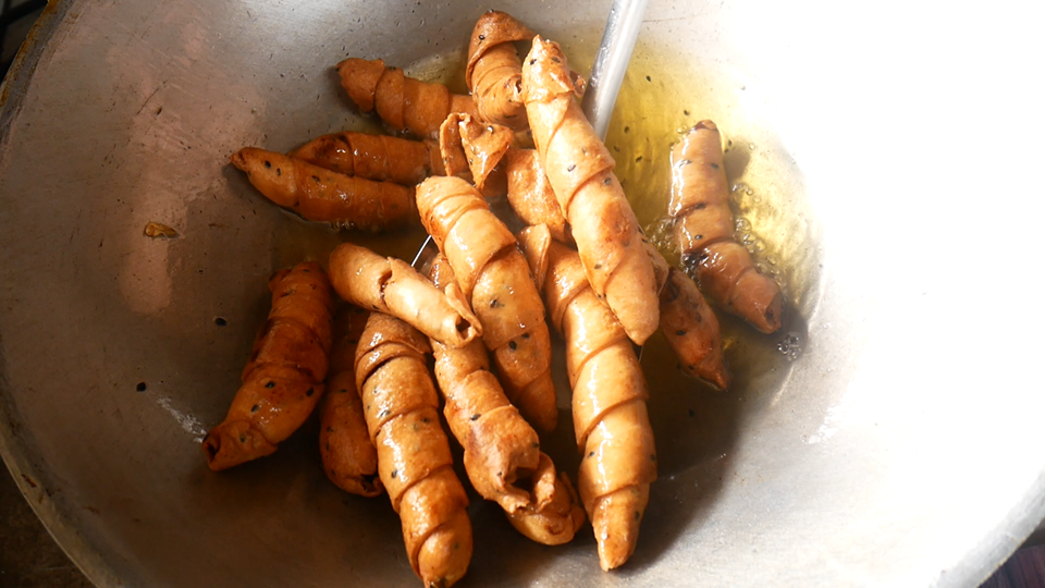 8. นำน้ำมันใส่กะทะตั้งไฟปานกลาง แล้วใส่กล้วยลงไปทอด หมั่นกลับบ่อยๆ เพื่อให้เหลืองสม่ำเสมอ