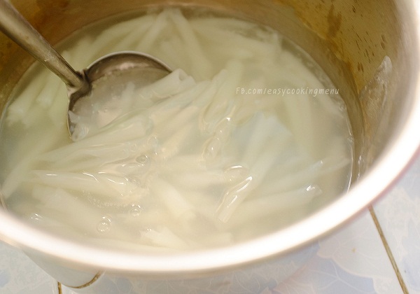 -ต้มน้ำให้เดือด ใส่เส้นกวยจั๊บลงไปต้มจนเส้นม้วนสวย และสุก จากนั้นใส่แป้งมันหรือแป้งข้าวโพดละลายน้ำลงไปให้น้ำข้น ๆ พักไว้