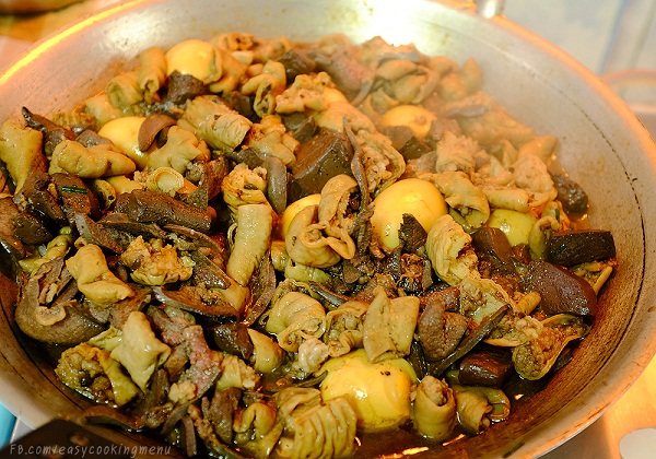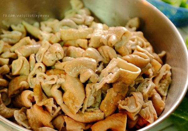 -ทำความสะอาดไส้ใหญ่หมู (เคล็ดลับ : อันนี้แม่เตรียมไว้ให้ แม่บอกว่า ไส้ที่ซื้อมาเขาล้างมาให้แล้ว แทบไม่มีกลิ่นแต่แม่เอามาทาเกลือ และแป้งมัน ล้างกลับอีก 2-3 รอบ) นำไส้หมูไปคั่วในกระทะให้กลิ่นไส้จางลงไปอีกจากนั้นนำไส้ไปต้มให้เปื่อย ประมาณ 1 ชั่วโมงกว่า ๆ (หรือเปื่อยในระดับที่พอใจ)