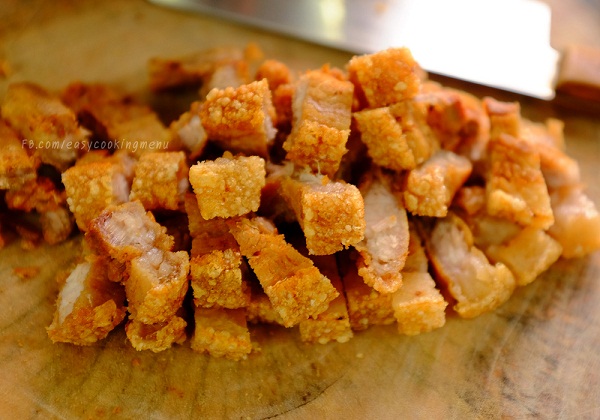 -นำหมูกรอบมาหั่นเป็นชิ้น ๆ เตรียมไว้