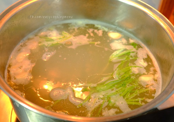 -ใส่น้ำลงในหม้อ นำขึ้นตั้งไฟ ใส่กระเทียมและรากผักชีทุบลงไป พอน้ำเดือด ใส่กระดูกซุป เกลือ และหมูสามชั้นลงไป (หมูสามชั้นสำหรับทำหมูกรอบนะคะ ยังไม่ต้องสงสัยว่าใส่ไปทำไม ต่อไปเดี๋ยวพบคำตอบแน่นอนค่ะ)