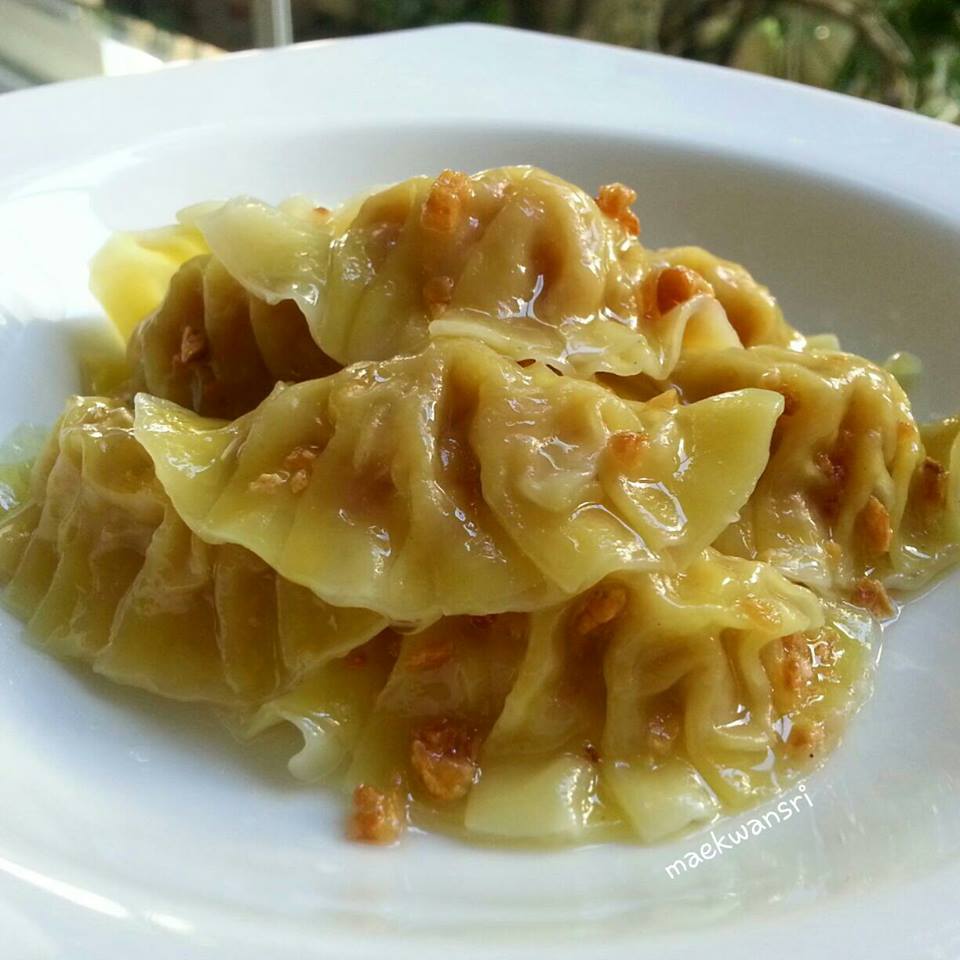 3.ห่อด้วยแผ่นเกี๊ยวแล้วนำไปลวกในน้ำเดือดให้สุกแล้วคลุกเคล้าด้วย น้ำมันกระเทียมเจียว พักไว้