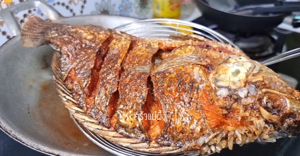 – เมื่อน้ำมันเริ่มร้อนใส่ปลาลงไปทอด ไฟปานกลาง ทอดรอจนปลาสุกแล้วค่อยกลับด้าน ปลาจะไม่ติดกระทะปลาทอดกรอบนอกนุ่มใน จะทานอร่อย