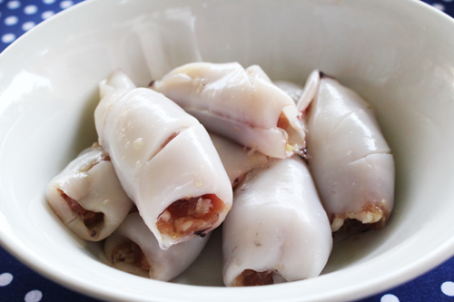 4.นำลงยัดในปลาหมึกที่ล้างทำความสะอาดไว้แล้ว ไม่ต้องยัดจนล้นหรือแน่นมากนะคะ เพราะเมื่อสุกแล้วเนื้อหมู