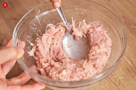 2.นำหมูบดลงไปโขลกผสมในครกต่อ เพื่อให้หมูนุ่นเหนียวขึ้นอีกนิด