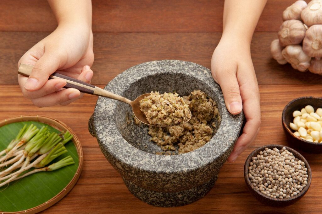 1.เริ่มจากจัดการกับสามเกลอ นำลงครกโขลกให้แหลก เราโขลกจนละเอียดเลยค่ะจะได้เนียนไปกับเนื้อหมู