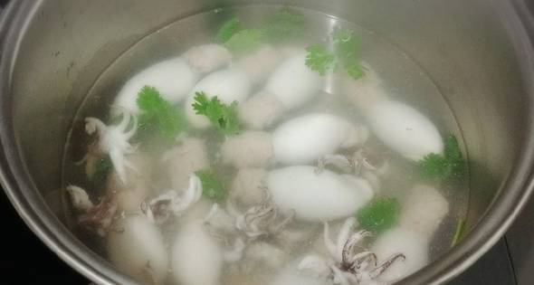 พร้อมรับประทานแล้วค่ะ ต้มจืดปลาหมึกยัดไส้ โรยหน้าด้วยผักชีตามชอบ เหยาะพริกไทยเล็กน้อย เราจะได้ต้ม