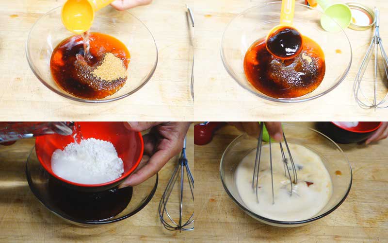 – เติมน้ำส้มสายชูกับซอสหอยนางรม และนำแป้งข้าวโพดมาผสมน้ำที่เตรียมไว้ คนให้เข้ากัน ใส่ลงในส่วนผสมซอส แล้วคนให้เข้ากัน
