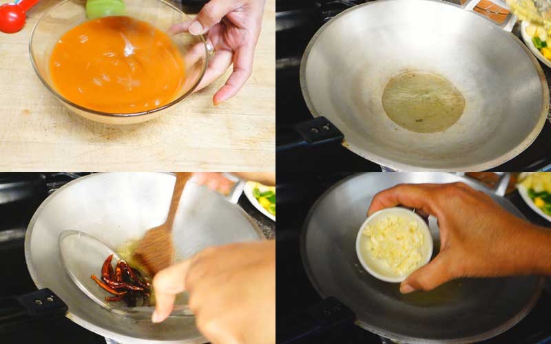 – ตั้งกระทะใช้ไฟอ่อน ใส่น้ำมันลงไป เอาพริกแห้งมาทอดให้กรอบ พักไว้ จากนั้นนำกระเทียมสับลงผัดให้หอม