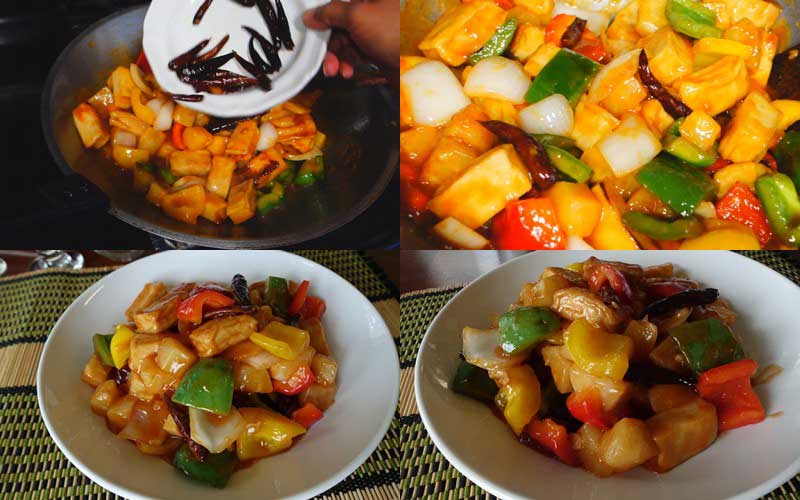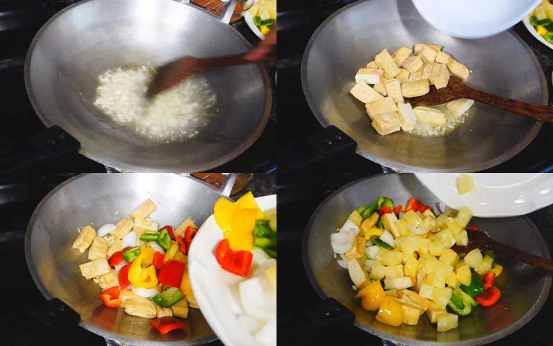 – พอกระเทียมผัดหอมแล้ว ใส่เต้าหู้ปลาลงผัดให้ร้อน เติมพริกหวาน 3 สี หอมใหญ่ และสับปะรดลงผัดให้ผักสุก