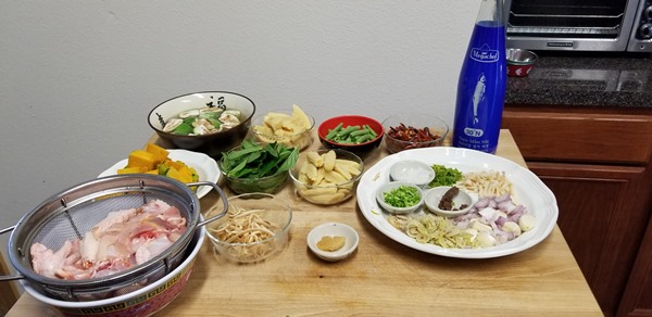 – เมื่อฟักทองเริ่มนิ่ม ใส่ กระชายซอย ผักถั่วฝักยาว ข้าวโพดอ่อน หน่อไม้ลวก หรือผักที่เราชอบ อยู่ต่างประเทศก็หาผักยากซักหน่อย ข้าวโพด ก็เป็นข้าวโพดในกระป๋องค่ะ ใช้ได้อยู่นะคะ