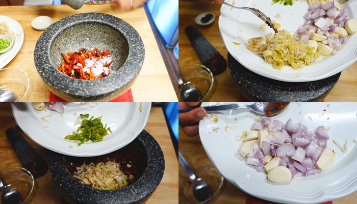 – ใส่รากผักชี ถ้าไม่มีใช้ก้านแทนได้เลยค่ะ หอมเหมือนกั้น และกะปิตำรวมกันจนละเอียดตามที่ต้องการ