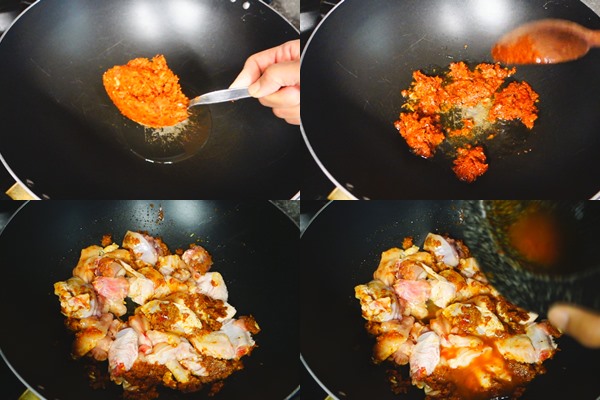 – ตั้งกระทะ ใส่น้ำมันนิดหน่อย นำเครื่องแกงที่ตำไว้มาผัดให้หอม แล้วใส่ไก่ลงผัดให้สุกนิดหน่อย ไก่จะได้เข้ากับเครื่องแกงได้ดี