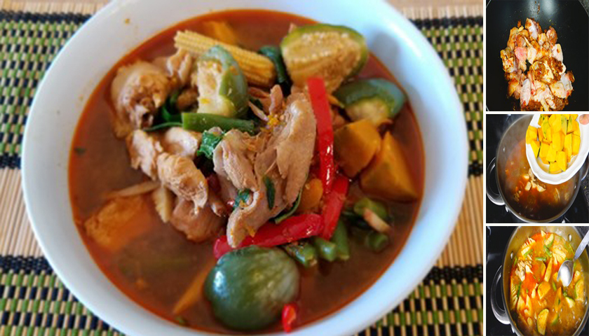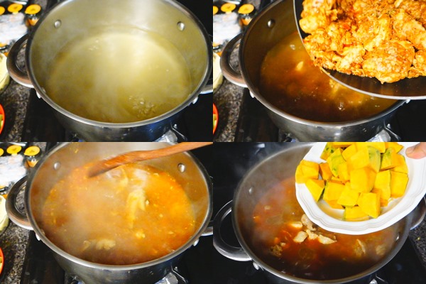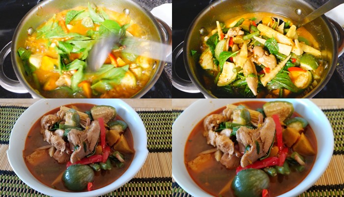 – จากนั้น นำไก่ที่ผัดกับเครื่องแกงมาใส่ในหม้อน้ำซุป ที่ตั้งไฟ คนให้ละลายเข้ากัน ใส่ฟักทอง ซึ่งเป็นผักสุกช้าลงไปเลยแล้วต้ม ต่อไปประมาณ 3-5 นาที