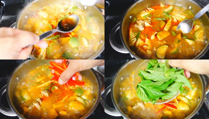 – ใส่มะเขือเปอะ ที่หั่นแช่น้ำเกลือไว้ ต้มต่อรอจนผักสุกนิ่ม ปรุงรสด้วย น้ำตาลปี๊บ เติมน้ำปลา ชิมรสให้ถูกใจ ตอนนี้หอมพริกแกงมากมาย เมื่อสุกแล้ว เติมพริกชี้ฟ้าแดง และใบโหระพา คนให้เข้ากัน