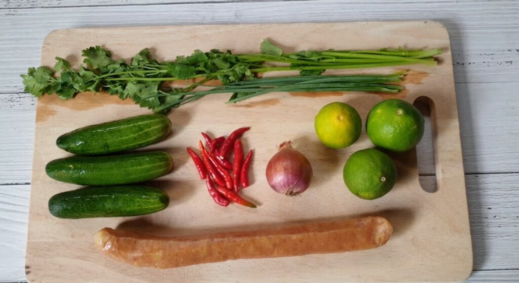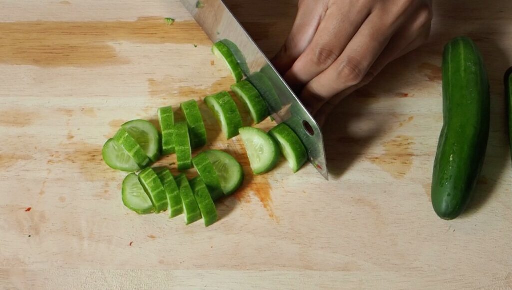 – แตงกวาจะหั่นเป็นชิ้นกลมๆ หรือหั่นครึ่งแบบนี้ก็ได้ มีเทคนิคคือหั่นให้ชิ้นหนาหน่อย เวลาเอาไปยำถ้าหั่นชิ้นบางมากทานแล้วจะไม่กรอบอร่อยค่ะ