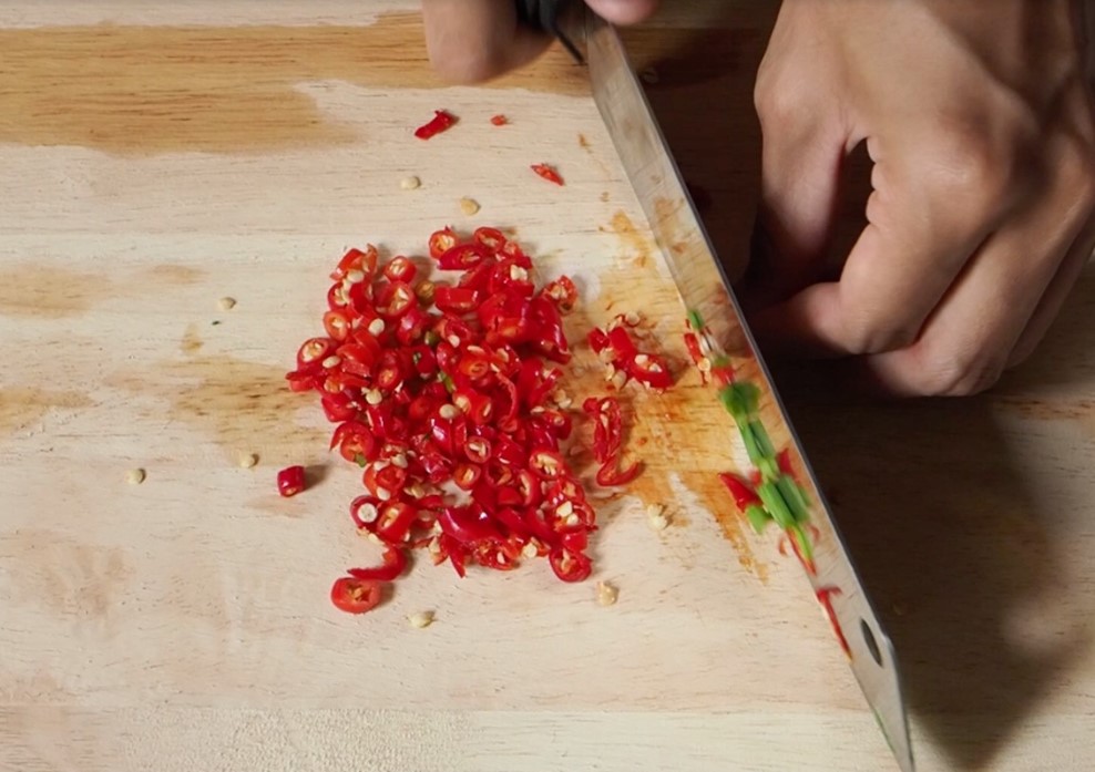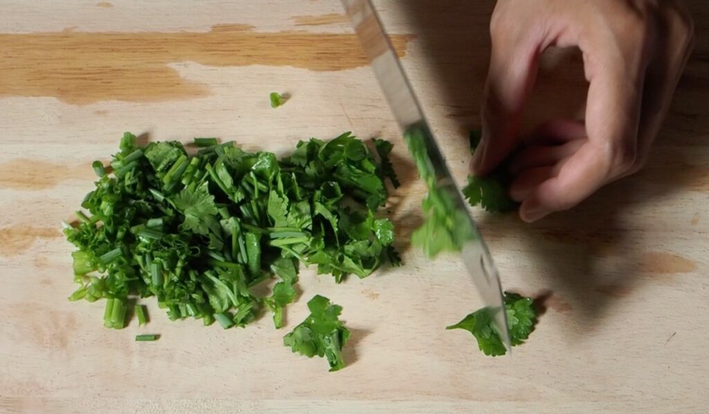 – เริ่มจากหั่นผักชีต้มหอมค่ะ หรือจะลองเปลี่ยนเป็นขึ้นฉ่ายก็หอมไปอีกแบบ หั่นพริกขี้หนูเน้นสีแดงจะช่วยเพิ่มสีสันให้ยำเราดูน่าทานมากขึ้นค่ะ
