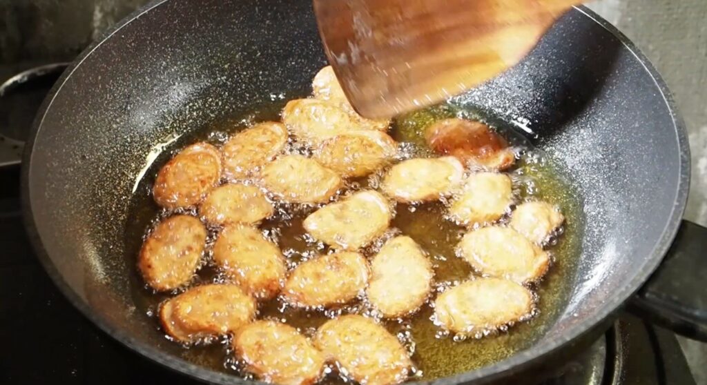 – จากนั้นตั้งกระทะจนน้ำมันร้อน ใช้ไฟกลางๆ ทอดกุนเชียงจนได้ระดับความเหลืองที่ต้องการ ก็เอาลงใส่กระดาษซับมันได้ค่ะ